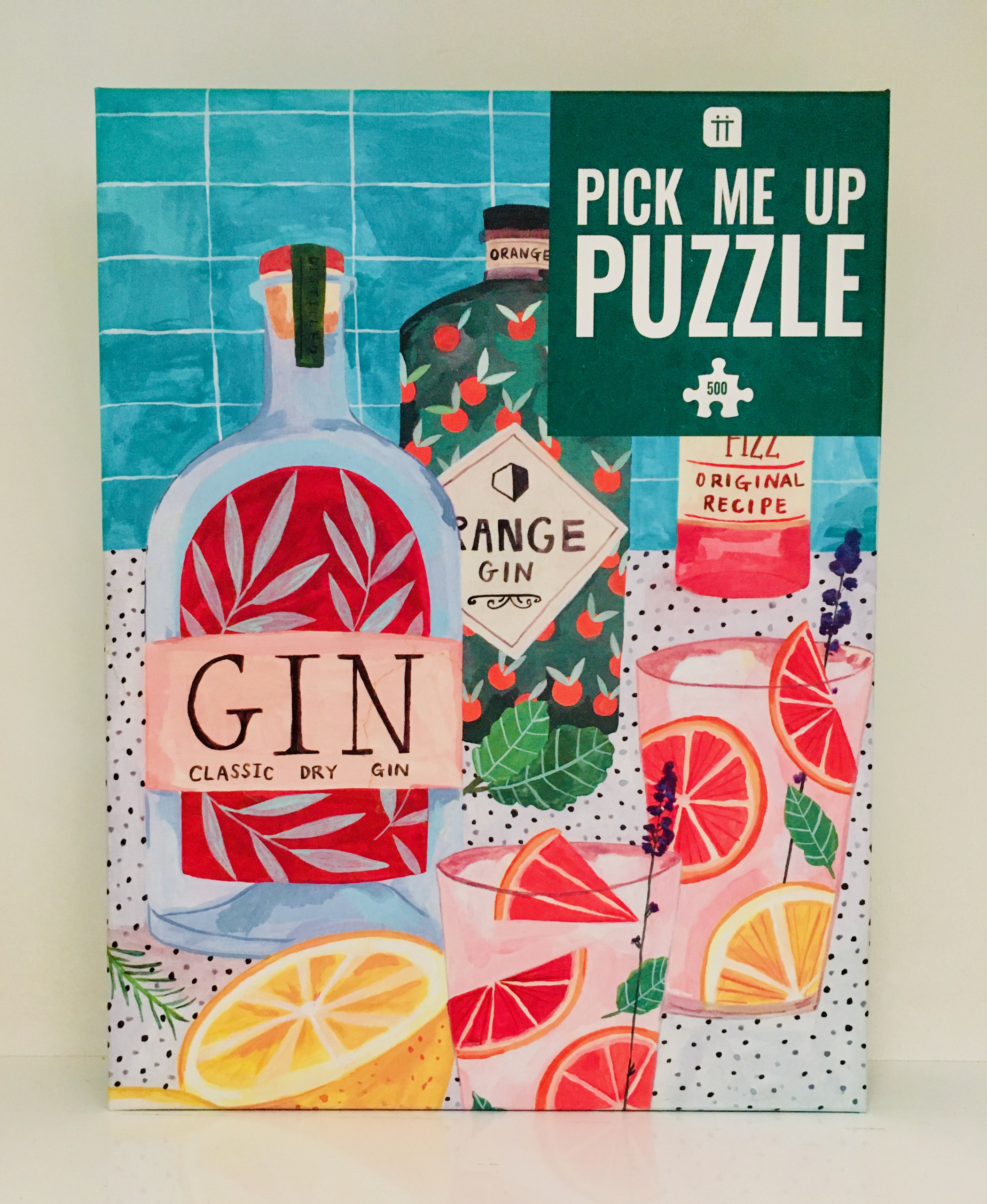 The jigsaw contains 500 pieces, and is illustrated with a painted scene of gin drinks and bottles.